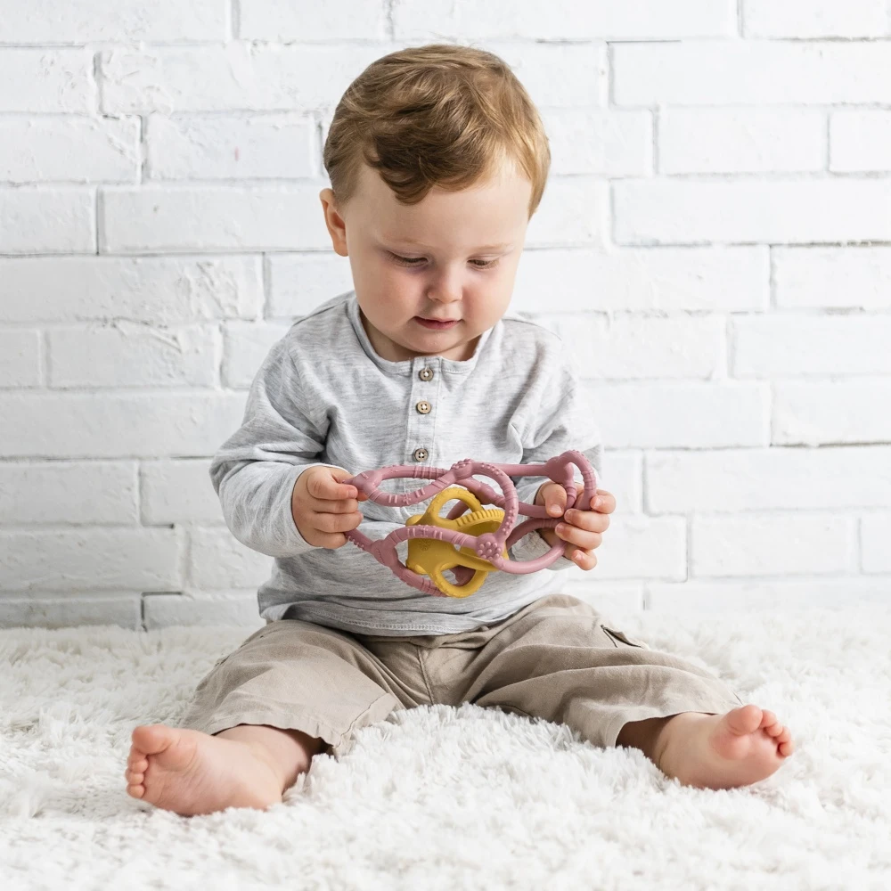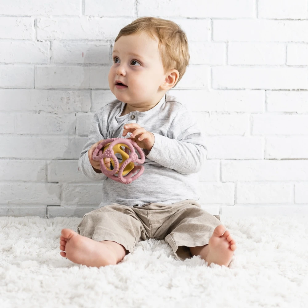 Découvrez ce set de 2 balles en silicone Rose et jaune de la marque Nattou. En silicone, elles seront facilement attrapable par votre bébé et l’aideront lors de de ses poussées dentaires en pouvant les mordiller.